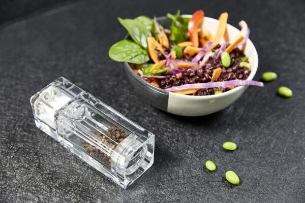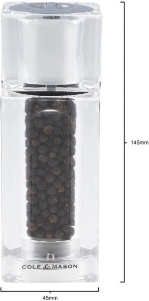Eine kompakte und stilvolle 2-in-1-Pfeffermühle und ein Salzstreuer aus hochwertigem, kristallklarem Acryl. Ausgestattet mit dem Cole & Mason Precision Karbonstahl-Mechanismus, der Pfefferkörner abstreift, anstatt sie zu zerkleinern, um eine maximale Geschmacksabgabe bei jeder Drehung zu gewährleisten. Sofort einsatzbereit, gefüllt mit hochwertigen vietnamesischen ganzen schwarzen Pfefferkörnern und fein gemahlenem Meersalz. Die Shakerkappe dient als Drehknopf zum Einstellen des Mahlgrades. Für eine feine bis grobe Einstellung einfach lösen oder festziehen. Verwenden Sie eine grobe Einstellung für Steaks oder Tomatensalat, eine mittlere Einstellung für Pizzen und eine feine Einstellung für Suppen und Saucen.