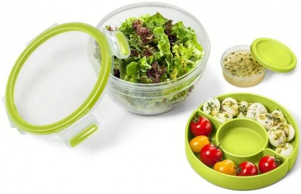 Einen Salat für unterwegs, in der Pause oder Zwischendurch ist eine prächtige Angelegenheit. Dennoch weicht er im Laufe des Tages oft durch Dressings und Toppings durch. Emsa liefert für dieses Problem eine platzsparende Lösung.