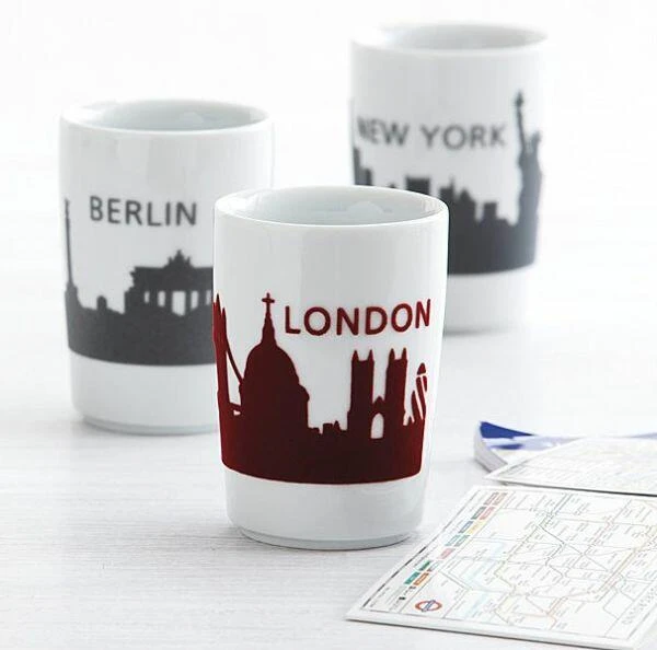 Becher Hannover in rot. Skylines erscheinen als erhabene, samtweiche Beschichtung auf dem Five Senses Maxi-Becher und schaffen ein besonderes haptisches Erlebnis.