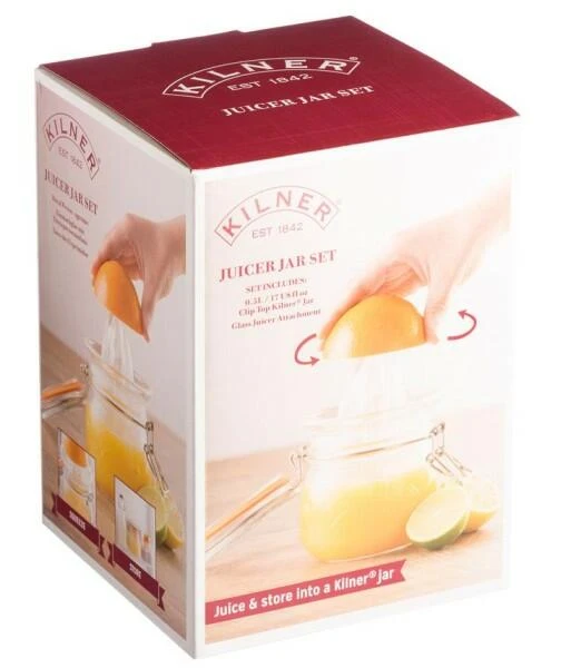 Kilner Zitruspresse mit Vorratsglas. Der ausgepresste Saft läuft direkt und Glas und kann dort sicher aufbewahrt werden.