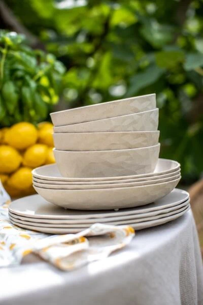 Die facettierten Teller sind wie eine frische Sommerbrise beim Outdoor-Lunch oder Terrassen-Dinner und halten auch turbulenten Feiern ohne jeden Scherbenhaufen stand. Ihre solide Materialität und die modernen Farben vermitteln stets das gute Gefühl eines schön gedeckten Tisches und bleiben dank ihrer schweren Qualität selbst bei einem kräftigen Windstoß stets standfest.