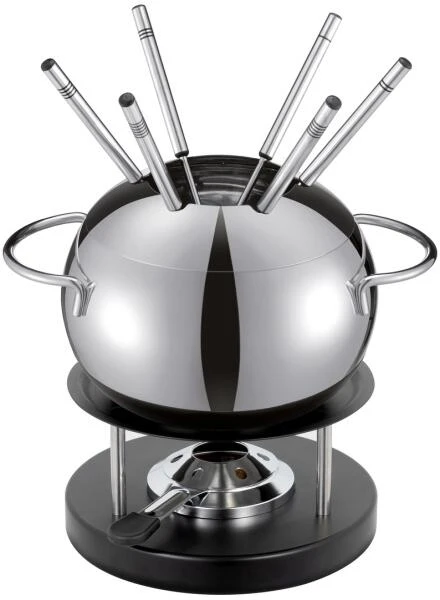 Das elegante Fleischfondueset aus Chromstahl, besteht aus: Fleischfonduetopf 2.9L ø16cm, Rechaud, Pastenbrenner gefüllt mit Brennpaste, 6 Gabeln und Spritzschutz. Einfach Brenner anzünden und geniessen.