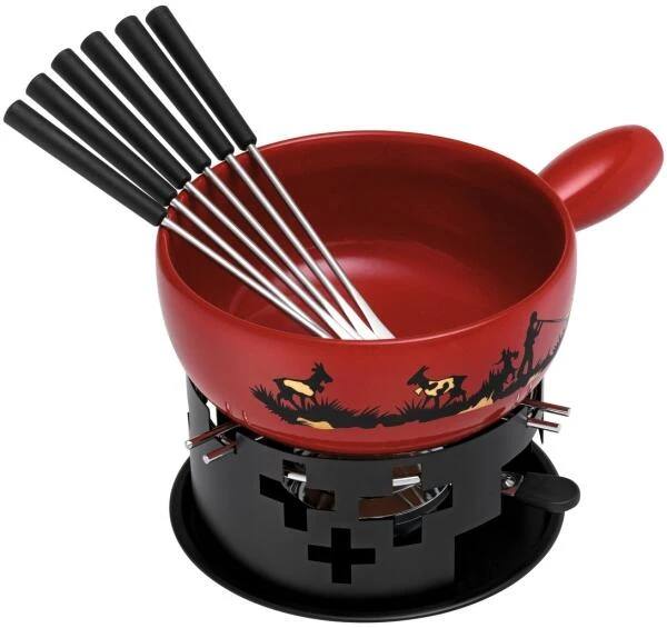 Rot glasiertes Caquelon mit Echtgold-Dekor macht jeden Fondue-Plausch zum glänzenden Auftritt. Zum hochwertigen Caquelon erhalten Sie das passende Rechaud, einen Pastenbrenner gefüllt und 6 Gabeln. Einfach Brenner anzünden und geniessen.