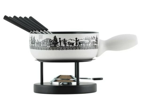 Der Caquelon hat ein bezauberndes Design. Weiß grundiert wird die Schweizer Alpweide als Scherenschnitt dargestellt. Das außergewöhnliche Muster macht Ihr Fondue zu einem Gaumen- und Augenschmaus.