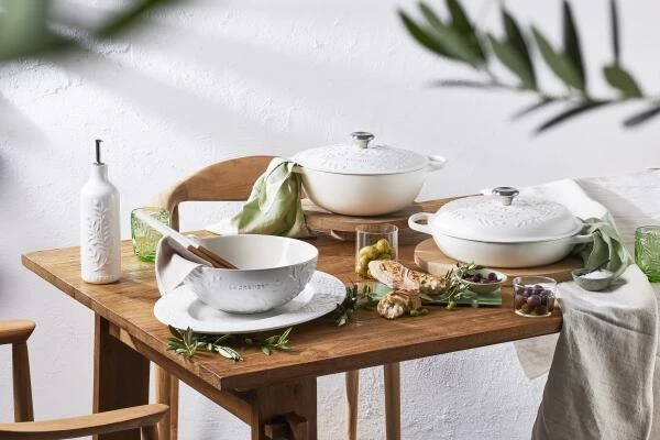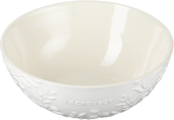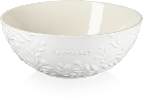 Le Creuset veredelt die Schüssel mit feinen Verzierungen und einem warmen hellen Farbton!