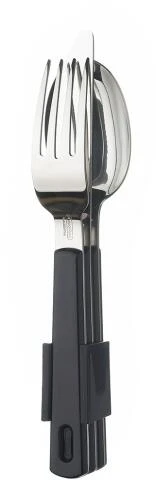 Ozeanfarbenes (blaues) Besteckset von Mepal, bestehend aus einer Gabel, einem Messer und Löffel. Ein Clip hält dies dreiteilige Campingbesteck ordentlich zusammen. Super praktisch!