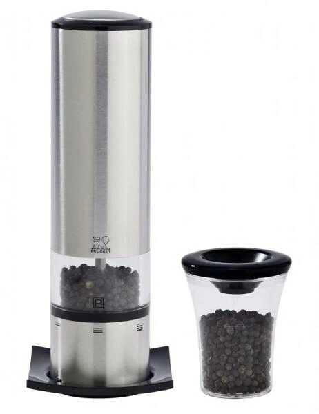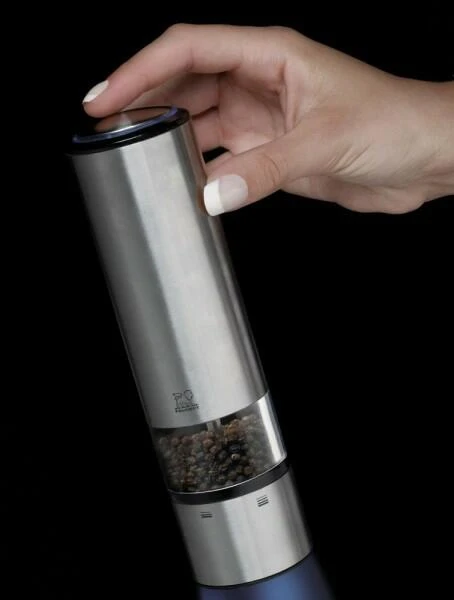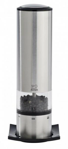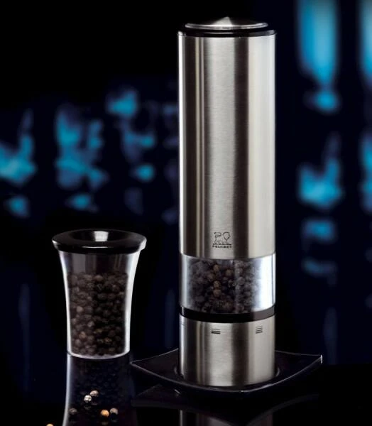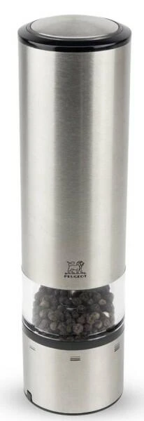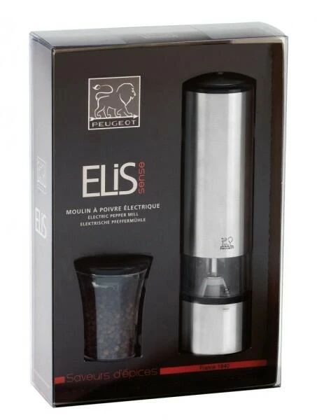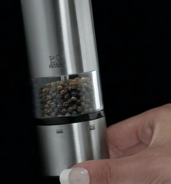 Peugeot Pfeffermühle Elis sense elektrisch aus Edelstahl und mit einer stufenlosen Mahlwerkeinstellung über den unteren Ring. Taktile Bedienung mit nur einer Hand ermöglichen ein Mahlen mit hohem Komfort und der gewohnten Schärfe eines Peugeot Mahlwerks. Mit den elektrischen