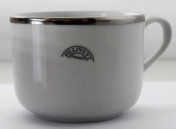 Pillivuyt Frühstückstasse Sancerre mit Platinrand. Pillivuyt Sonderanfertigung, bei der Kaffeetasse und Untertasse mit einem Platinrand verziert sind.