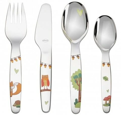 Rösle Kinderbesteck „Waldfreunde“ 4-teilig. Das Kinderbesteck-Set kommt mit einer süßen, kleinen Geschichte daher, die perfekt vorgelesen werden kann, um die Kleinsten zum Essen zu motivieren.