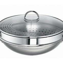 Rohe Wok-Set Ravenna, 34 cm. Ideal für Wokgerichte und gedämpfte Speisen. Set besteht aus Wok, Dämpfaufsatz, Ablagegitter und Glasdeckel. Für alle gängigen Herdarten, inklusive Induktion.