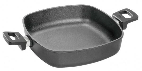 Für beste Kochergebnisse sorgen der ca. 8 mm starke Boden aus spannungsfreiem Aluminium-Kokillen-Guss und die dauerhaft beständige und schnittfeste Antihaftversiegelung aus Hightech-Titanium. Die Seitengriffe sind backofenfest bis 250 °C.